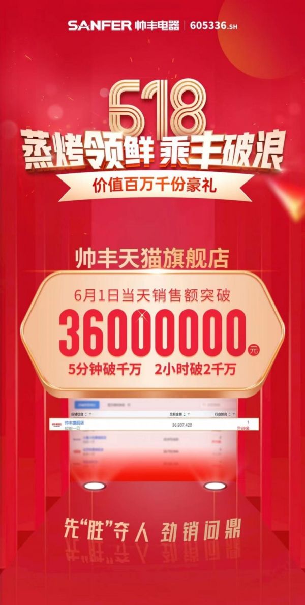 从首日3600万的总销量,到价值百万的千份豪礼,帅丰集成灶在618这场行业大考中早早交上了一份亮眼成绩单,再次领跑行业。