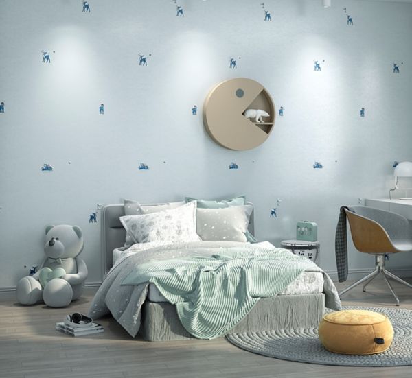 卡通萌趣的梅花鹿,时而迈着四方步在草地上散步,时而在樱花树下静卧、时而在小河边喝水,轻松自在,无忧无虑。墙布本身环保材质,无甲醛、无PEC(化学危险品)、无重金属成分,健康安全,高精密度织成,防水防污、透气防潮,梅花鹿密绣工艺,色彩设计十分有趣,灵动活泼,像一只只可爱的小精灵,还孩子一个缤纷萌趣的世界。
