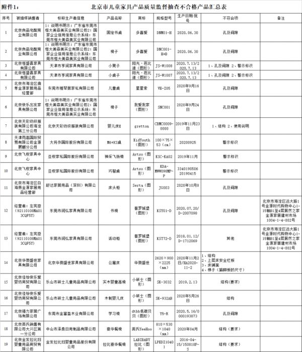 其中,儿童家具不合格名单显示,9批次产品孔及间隙不合格,包括2批次由北京良品宅配商业有限公司销售的“多喜爱”牌固定书桌(规格型号DNM01-H,生产日期/批号2020.06.30)、椅子(规格型号DNC001-H+B,生产日期/批号2020.06.30);2批次由天津市亨润家具有限公司生产的“阳光·芭比诺”牌小凳子(规格型号JS-W1008,生产日期/批号2020.7.13/2020.7.13)、小桌子(规格型号JS-W1007,生产日期/批号2020.7.13/2020.7.13)。