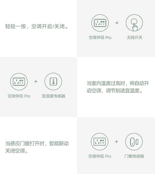 例如:米家空调伴侣 Pro万能遥控版跟无线开关联动,即可实现空调随时随地的开启、关闭;