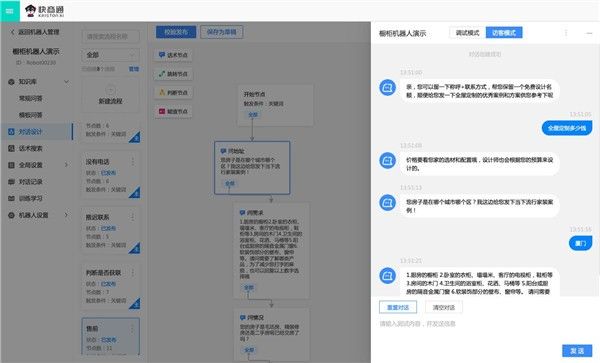 在试用过程中,智能人机对话平台(KICP)展现了强大的对话理解能力。在语义相似度分析、意图识别、语言关系推理等方面的表现出优异性能,使营销套电机器人可以根据用户表述的主题、具体内容、上下文语境,精准识别用户需求,进行准确且具有针对性的回复。依托快商通自有专业语料库,基于KICP搭建的营销套电机器人还实现了对家居行业专业问题的精准回答。
