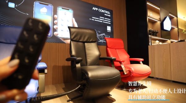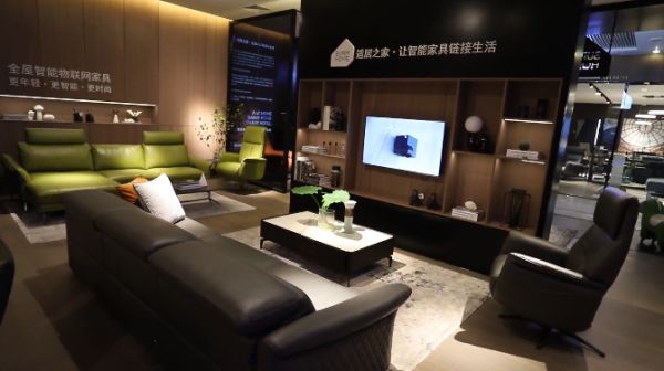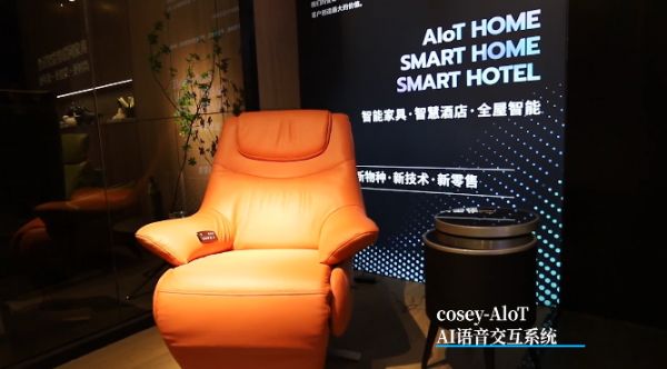 比如门店重点展示的这款智能语音沙发Cosey-IoTⅡ,集成了杂物收纳、蓝牙音响、无线充电、USB接口等功能及设施,顾客可根据自身的坐姿或者躺姿需求,任意调节沙发头部和腿部倚靠部位的角度,也能语音控制家电和设置与开关、安防、照明、影音等相关的场景联动,轻松定制属于自己的智能生活。