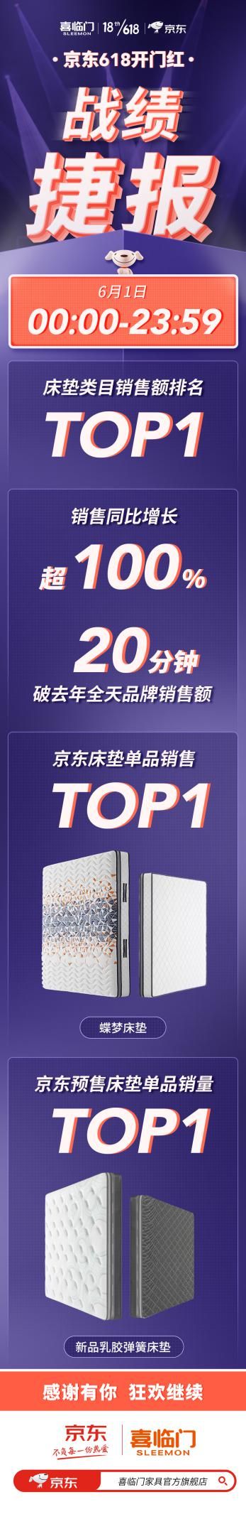喜临门京东平台六店齐发力,铺设差异化产品矩阵,网罗多层级消费者,仅6月1日当天,同品类成交额位列TOP1,20分钟即突破去年全天品牌销售,同比增幅121%。