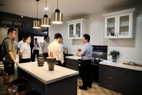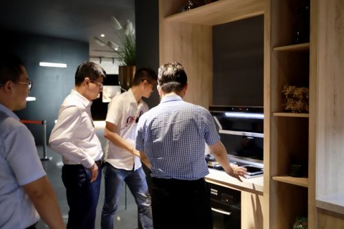 在钱董的带领下,京东张总一行首先实地参观了美多高端厨电生活馆,这里是展示美多形象和产品的最直接窗口,不仅可以直观感受到美多专注厨电32年的发展的深厚底蕴,也能零距离接触美多产品的独特魅力以及匠心工艺。