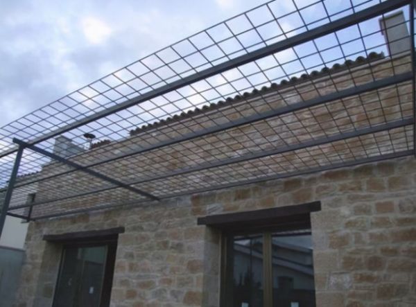 除了能遮阴纳凉之外,搭建成这样的凉棚还有一个好处就是施工简单,基本上自己也能进行搭建,确定好顶部的一个尺寸,到建材市场购买裁剪钢丝网,可相应大一些。自己找把梯子然后将钢丝网每个角分别固定在柱子上即可。