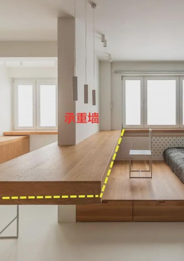 文章标题中提到,建筑承重墙周围做了木质台面,非常好地区划出了4个功能分区,接下去我将来详尽的讲一下子: