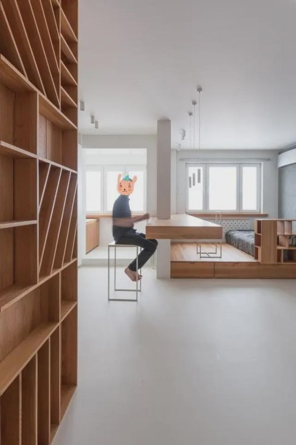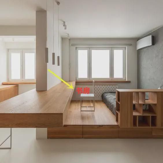 反过来再看一下卧室这一边的木质台面,完成能够作为书桌运用。将台面抬高50公分,再摆上上凳子,这里完全便是一个小房间。