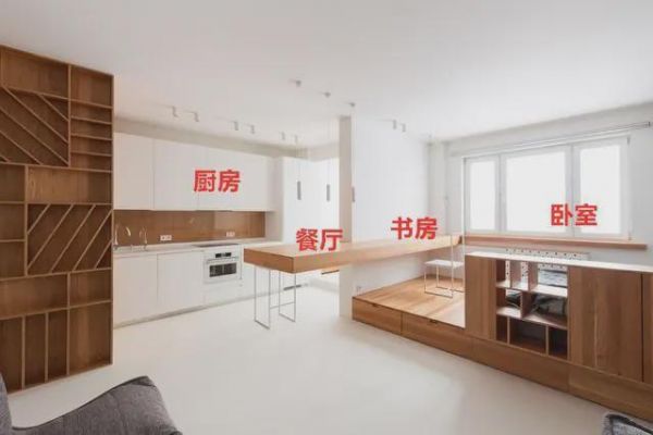 这样一细算,在承重周围做上木质台面,这个室内空间瞬间就用了厨房、餐厅、小房间及其卧室4个运用功能分区。一个单单只有四十㎡的小户型也就可以实现“麻雀虽小,五脏俱全"!