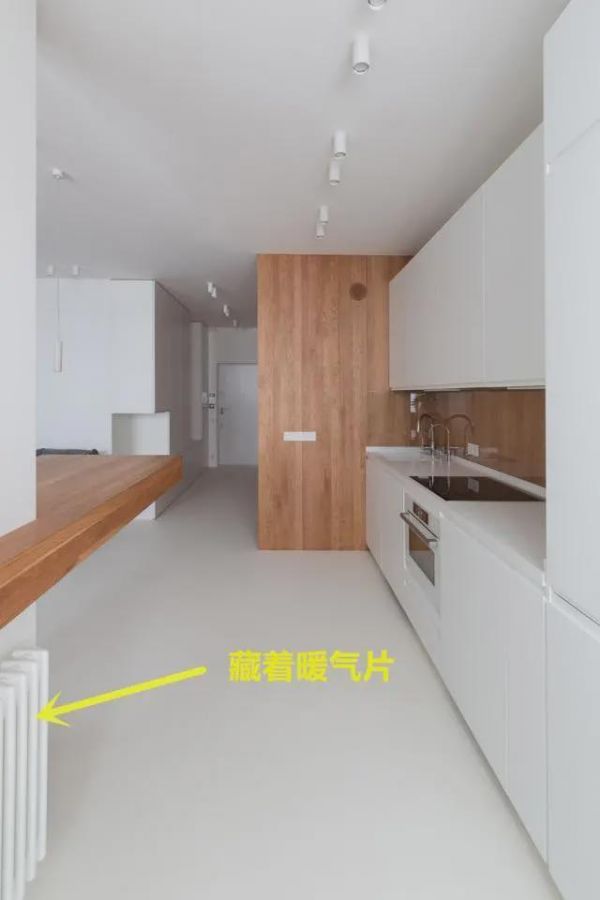 说完4个功能的区划以后,再来说说某些小细节上的东西。木质台面下全部都是悬空的,居于室内空间利用基本原则,这一些室内空间自然不可以浪费掉了。家里要有安装暖气片,就可以把它塞到这里来。非常好的利用了空间之余,也让室内空间总体看上去更为的清爽美观。