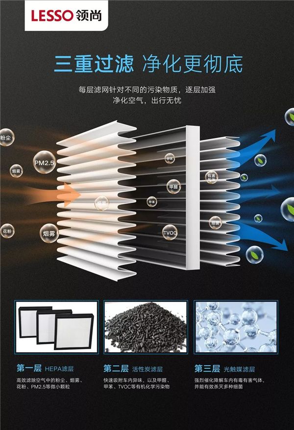 领尚车载空气净化器内置“HEPA滤层+活性炭滤层+光触媒滤层”三层过滤网:HEPA滤层能高效滤除空气中的粉尘、烟雾、花粉、PM2.5等微小颗粒;活性炭滤层则可快速吸附车内异味,以及甲醛、甲苯、TVOC等有机化学污染物;光触媒滤层能强烈催化降解车内有毒有害气体,并能有效杀灭多种细菌。通过层层过滤,它能够快速吸附车内异味,过滤掉车内的粉尘以及肉眼看不见的杂质,还车内一片健康新鲜的空气。