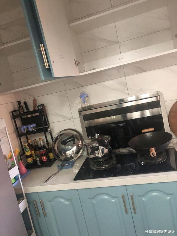 屋主在装修的时候其实纠结了很长一段时间,最终还是选择做了集成灶,入住进来使用之后非常满意,觉得集成灶使用非常方便,也有利于做保洁。左侧专门的调料置物架,可以把这些东西有序收纳起来,真心不错。左侧的位置放着冰箱,大小位置合适。