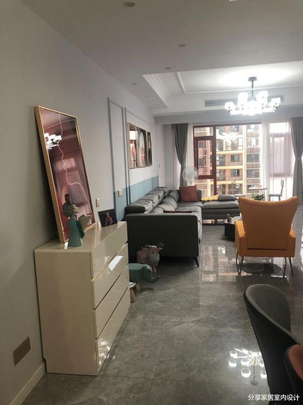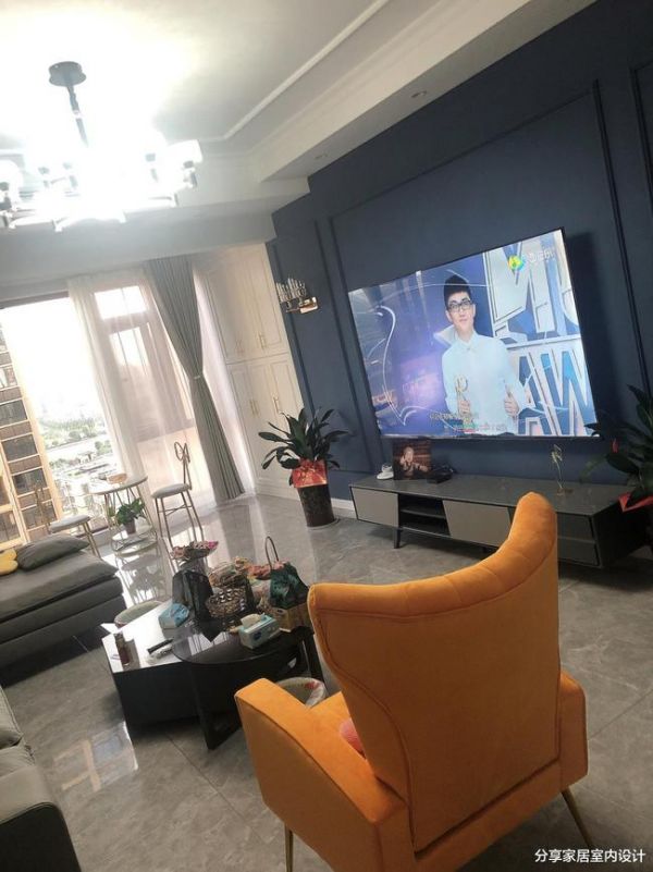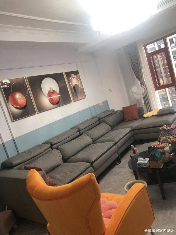 客厅布置了“L”字型的布艺沙发,坐着特别舒服,比较喜欢这种款式的,不管是躺着还是坐着,都非常方便。不过可以搭配一些带其他颜色的抱枕,效果会更完美。旁边搭配了一把橙黄色的沙发椅,可以起到点缀空间氛围的作用。终于可以搬新家入住了,一家人都非常开心,可以坐在沙发与家人一起聊聊天,喝喝茶,特别幸福!