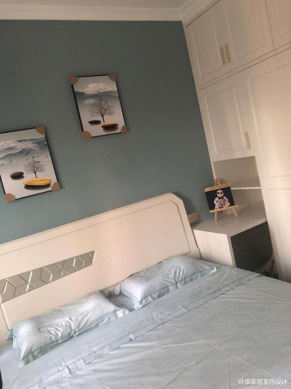 次卧床头背景墙刷了蓝色乳胶漆,床头柜和衣柜组合一体的设计,给人的感觉更有空间感,这样设计对于空间来说,更合适。墙上挂着装饰画,显得没有那么单调,一些装饰性的东西还是很有必要的,比较喜欢蓝色,床上四件套都是蓝色调,给人一种非常清爽的感觉。