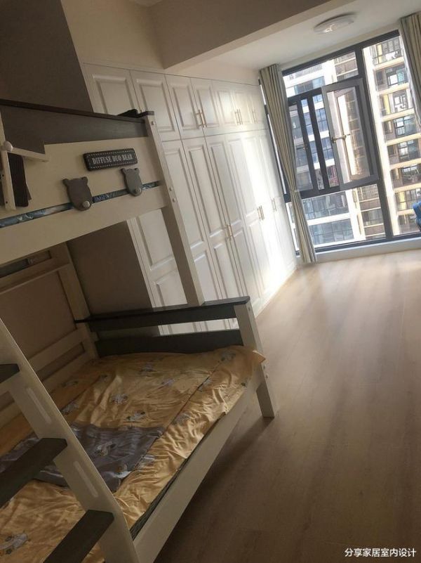 儿童房空间其实还是比较宽敞的,一张上下床,加上一个顶天立地的衣柜,右边还是有很多的空间,方便家里小孩玩耍,到时候可以布置书桌台,方便家里小孩写作业或者看书。三个房间地面选择铺贴木地板,没有瓷砖那种冷冰冰的感觉,更舒适。