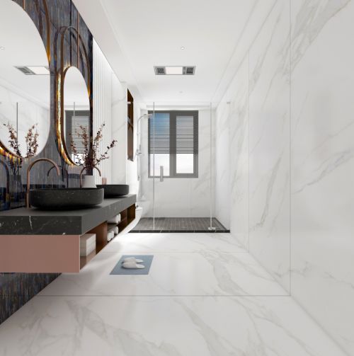 卫浴空间上讲究层次感,墙地一体化的设计,在变与不变中完美融合了中式的韵味和风情,也营造了静谧美好的气氛。