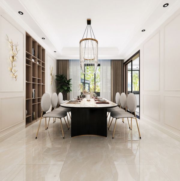 以轻奢+复古混搭的欧式餐厅,布置典雅高级的家具,让空间显得更加华丽精致,提升了用餐的仪式感。