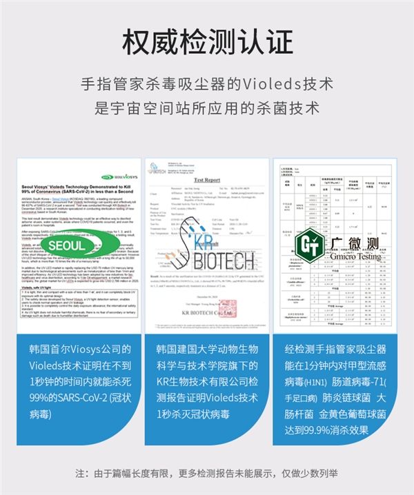 经广东省微生物分析检测中心的权威检测,手指管家J81系列杀毒吸尘器,可以对包括大肠杆菌、金黄色葡萄球菌、肺炎链球菌、白色念球菌、H1N1病毒、肠道病毒-71型在内的多种有害病毒实现99.9%的平均灭杀率。也是国内权威机构对我们产品的有力背书。