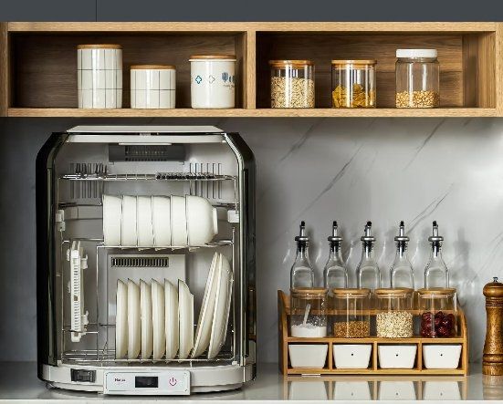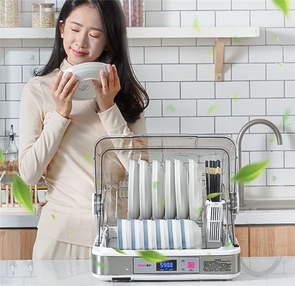 韩加这种台式消毒柜的好处还在于可以作为餐具收纳柜,将餐具放进密闭的消毒柜里,让平时散落在厨房各处的餐具有序收纳起来,给厨房腾出空间,保持厨房整齐、清爽,也有效杜绝蟑螂、蚊蝇肆意攀爬带来的污染。