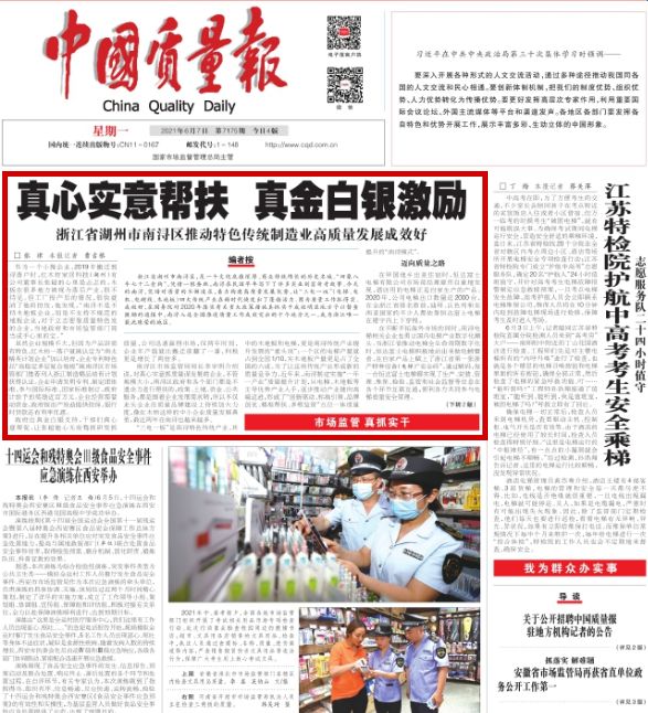 近日《中国质量报》头版头条聚焦南浔,发表了关于“真心实意帮扶,真金白银激励,浙江省湖州市南浔区推动特色传统制造业高质量发展成效好”的新闻报道。