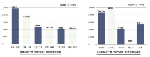 究竟是哪些人群在关注“室内健康”相关话题?“一线城市”“30岁以上”、“男性”是三个显著标签。报告显示,去年北京互联网用户对“室内健康”相关文章阅读数接近2.5亿,在四大一线城市中遥遥领先。