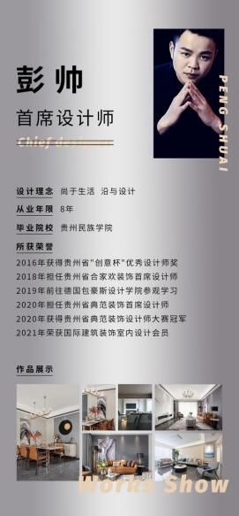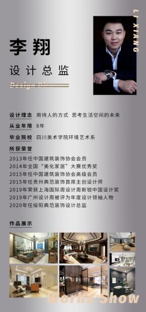 典范装饰现首席设计师,在德国包豪斯设计学院交流学习进修深造。2016年获得贵州省“创意杯”优秀设计师奖,2020年获得贵州省设计师大赛冠军,并且多次在国内大大小小奖项中获奖,是一名以客户体验感为主导的设计师新星, 专注于细节,致力于完美无缺的创造理念。独为个性宅屋、艺术类机构及会所的设计。