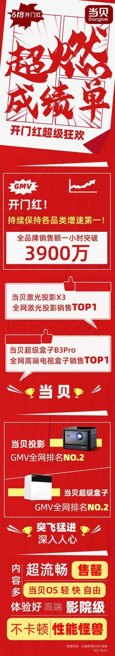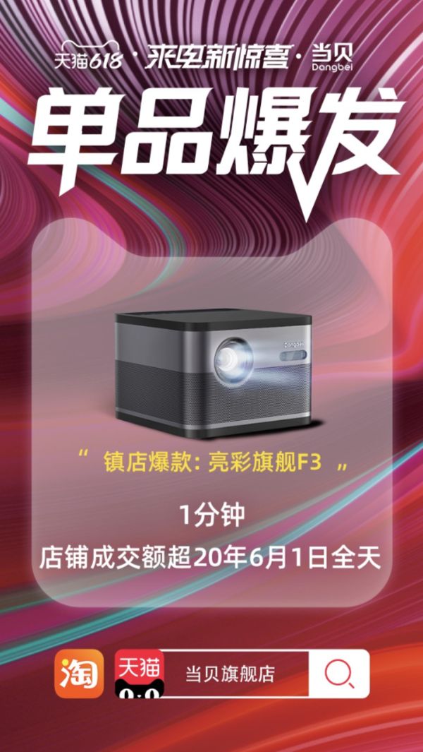 今年618,当贝投影在开门红首日全品牌销售额一小时突破3900万,持续保持各品类增速第一。旗下家庭旗舰投影仪当贝F3更是以优越的成绩在活动开始的第一分钟就完成了2020年6月1日全天的成交额。以此同时,旗下激光投影当贝X3也成为全网激光投影销售TOP1;当贝超级盒子B3PRO也成为全网高端电视盒子销售TOP1。