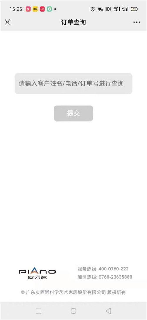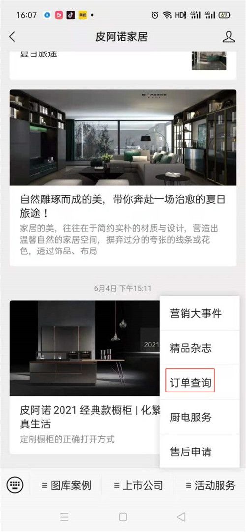 STEP1:微信搜索“皮阿诺家居”公众号,在二级菜单栏“活动服务”中点击“订单查询”,在查询框中输入客户姓名、电话、订单号均可一键查询。