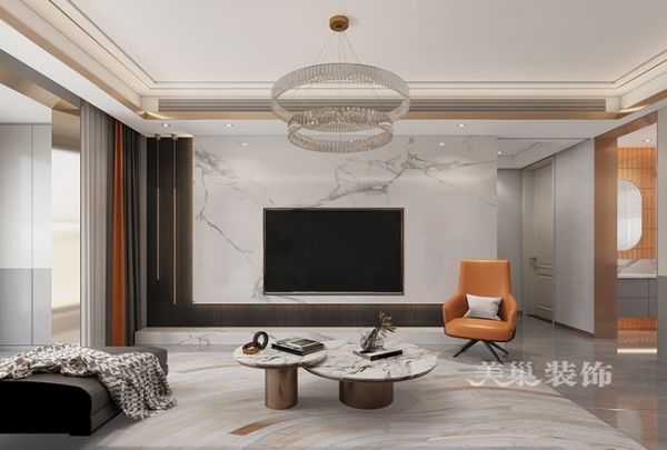 电视背景墙选择木质隔板打底,大理石上墙,简约又高级,没有其他多余的繁琐装饰,