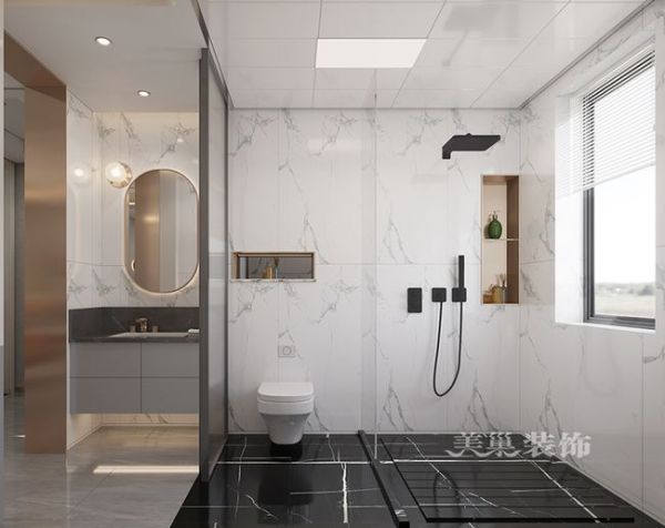 卫生间设计,墙面采用白色大理石瓷砖,地面则是黑色,形成鲜明的对比,壁龛的设计将空间利用到最大化。