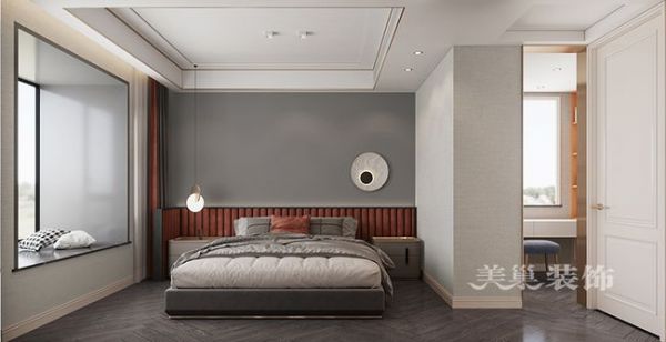 主卧用灰色乳胶漆作为床头背景墙,简约而不简单,飘窗利用起来做成休闲区,没事的时候在这里欣赏窗外的自然景致特别惬意。