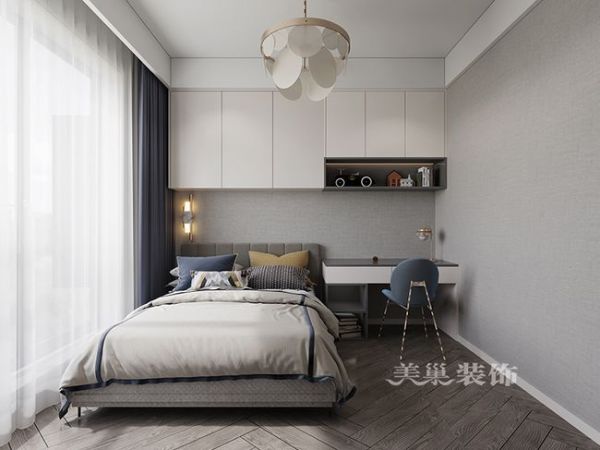 男孩房延续客厅的墙布设计,悬空收纳柜满足收纳需求,书桌的设计提高了空间利用率,整个空间干净利落又舒适。