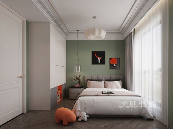 女儿房选择青绿色乳胶漆作为背景墙,挂上几幅抽象画,带来不一样的视觉效果,地面采用实木地板简约又时尚。