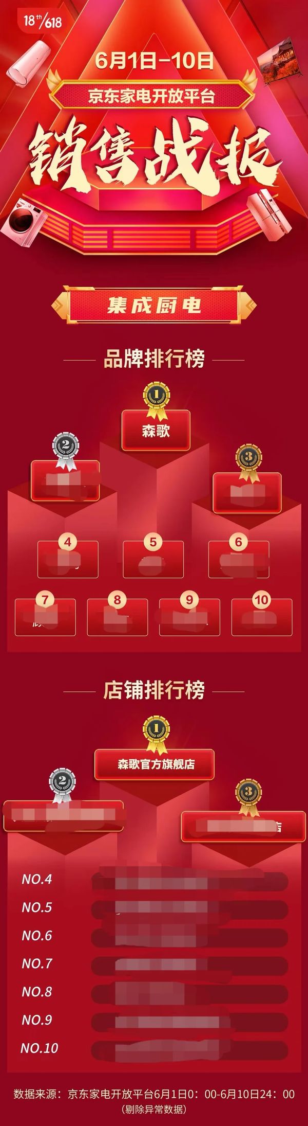 作为上半年最重要的节点,618是品牌和商家快速获得生意增长的绝佳时机。各大品牌围绕618制造声量,抢占用户心智也是各显神通,极尽能事。今年的618赛程已经过半,悬念几乎已经揭开,6月1日-10日,森歌又一次占据了京东集成厨电品牌排行榜和店铺榜双榜冠军。