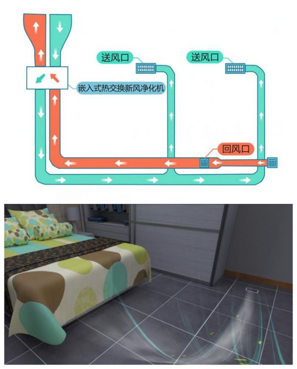 大家都知道,新风系统主机可将室外新鲜空气过滤净化后,送入卧室及客厅等最需要新鲜空气的地方,每天24小时不用开窗,也能享受如大自然般的新鲜空气。同时它还将室内污浊空气、甲醛等挥发性有害物质不断排至室外,有效改善室内空气质量。此外,该系统还承担了灭菌、防尘、通风除异味的作用,成为目前很多楼盘解决粉尘、甲醛、细菌、缺氧等问题的解决方案。一般有顶送风和地送风两种方案。