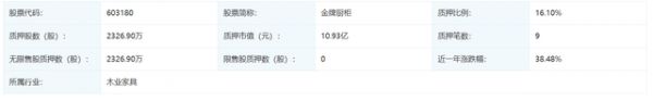 为置换原融资及补充运营资金,金牌厨柜实控人之一温建怀质押股份。6月9日,公告称,温建怀质押330万股,占其所持股份比例20.39%,占公司总股本的2.28%,质权人为西藏信托有限公司。