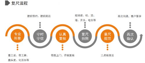 为保障客户的利益,爱阁工房严格规范了复尺的服务流程。由专业人员准时上门复核,确保设计效果准确无误,为后期安装扫清障碍。每一处关键细节都会有专门人员拍照确认,在确保无误后与客户再次沟通签字。