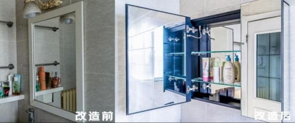从前卫生间光线不好,洗漱时全靠镜前灯,整体储物的空间设置也不合理,东西只能堆在洗脸池旁边,显得凌乱又容易积灰。换新后的智能浴室柜使用高清银制镜面,手指触控即可打开高亮LED灯条,轻松照亮昏暗的室内空间;镜面还添加一键除雾功能,浴后轻触开启,镜面蒸汽迅速消失无踪;镜子背后隐藏的多层收纳空间,让洗脸池边的杂物也都有了完美去处。