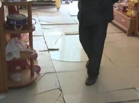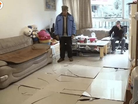 梅大爷的儿子闻讯回到了家里。整个客厅一片狼藉,就像地震了一样,期间不断发出刺耳的响声,随后看到的便是整个地砖碎的碎、翘的翘,损坏的面积大概有40到50平方米。