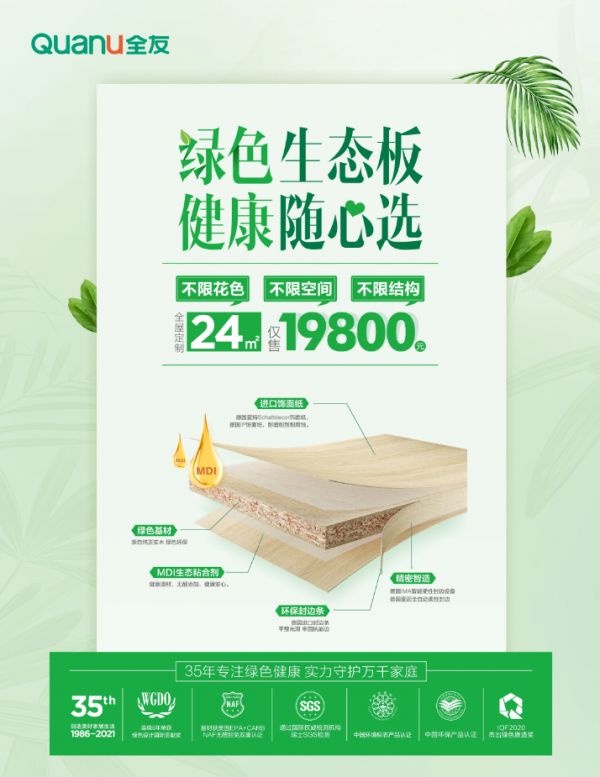 为满足消费者的健康居家需求,全友推出“绿色生态板”,以尖端技术将无甲醛的MDI环保粘合剂运用在板材生产中,经专业测试,全友绿色生态板的甲醛释放含量≤0.016mg/m³,比国标E1级(甲醛释放量≤0.124mg/m³)更低,让消费者在家也能享受纯净空气,自在“森”呼吸。
