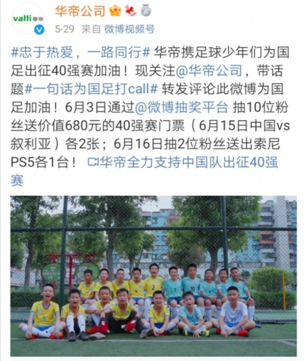 与此同时,华帝还在官方微博、公众号发起了“一句话为国足打call”话题活动,呼吁大家参与助威国足出征,赢取世预赛门票、PS5游戏机、蓝牙音箱等豪礼,汇聚更多的力量,力挺国足。