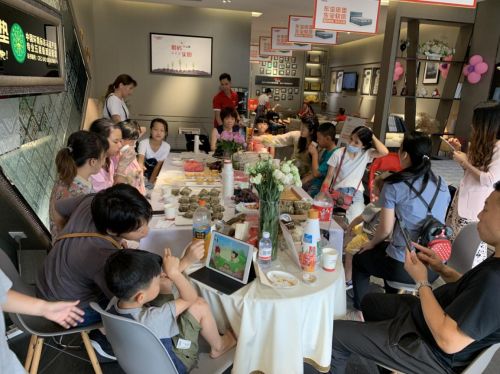 盛夏的时令美食,非粽子莫属,现场包粽子活动开始!工作人员们早早准备好了粽叶、糯米、餐盘等,大家围成一圈,七手八脚地包起了粽子。“先拿一片粽叶把它卷起来,卷出一个角,这样糯米就不会漏出来。”大家有说有笑,互相交流包粽子的方法,其乐融融。绿豆馅、红豆馅、三角形、长条形等各式各样的漂亮粽子,让大家在玩乐中感受到节日的气氛。