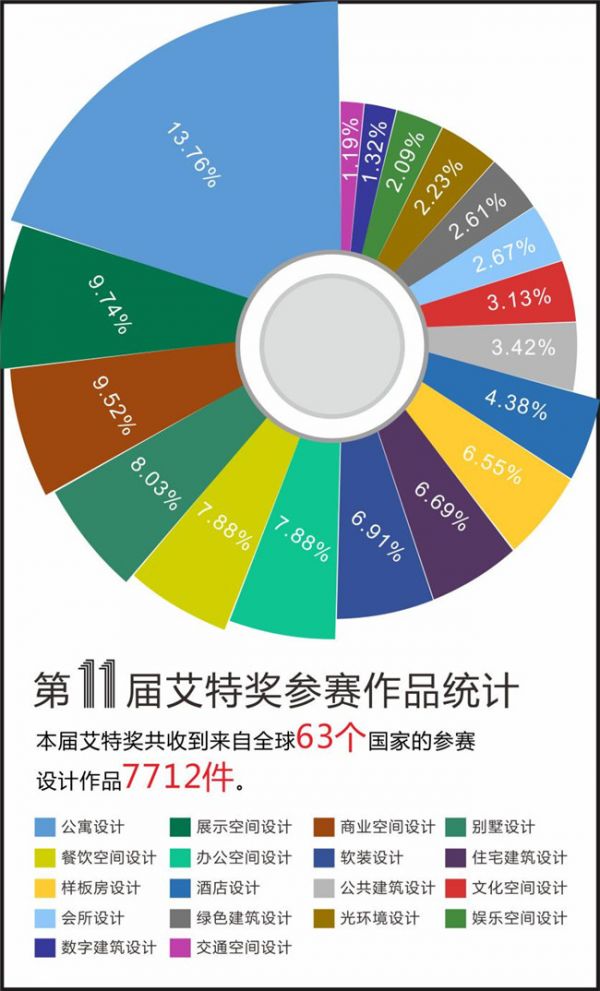 今年,第11届艾特奖共收到来自全球63个国家的参赛设计作品7712件,从建筑设计到室内设计,从陈设艺术到光环境设计,囊括公共建筑、住宅建筑、绿色建筑、数字建筑及商业空间、文化空间、展示空间、交通空间、办公空间、餐饮空间、娱乐空间、酒店、会所、别墅大宅、公寓、样板房、陈设艺术、光环境艺术等。参赛国家、参赛作品数量均突破以往。