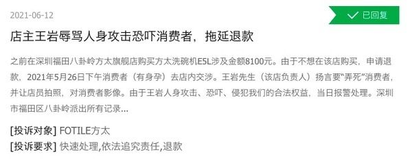 据消费者投诉称,其在深圳福田八卦岭方太旗舰店购买方太洗碗机E5L涉及金额8100元,由于最终不想在该店购买并希望申请退款,于2021年5月26日下午去店内交涉。过程中该店负责人称要“弄死”消费者,并进行人身攻击和恐吓。该消费者为孕妇,当日其报警处理,福田区一派出所接警。但该店至今未退款,售后态度依旧恶劣。方太方面对此表示,正在核实处理中。