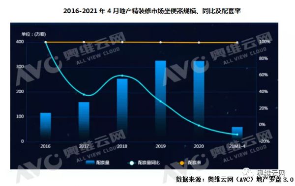 在地产精装修市场,坐便器向来是标配部品,得益于楼市大环境趋稳、精装修政策的持续推进,坐便器在地产精装修市场的配套规模也随之水涨船高。据奥维云网(AVC)地产罗盘3.0显示,2016-2020年,坐便器规模维持增长态势,虽然2020年疫情影响了市场,但坐便器的规模依然与2019年持平。2021年1-4月,坐便器配套住宅规模58.73万套,配套率达100%。