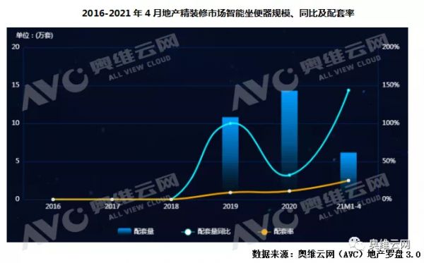 在人们更加追求品质化、健康化、人性化、智能化的卫生间生活理念下,智能坐便器市场维持了稳定的增长态势。据奥维云网(AVC)地产罗盘3.0显示,2021年1-4月地产精装修市场智能坐便器配套住宅规模达13.97万套,同比高增49.0%;配套项目168个,同比68%,配套率为23.7%,同比增长9.6个百分点。