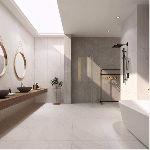 其次,在瓷砖色彩上,这三款瓷砖均为冷白色调,如鱼肚白和卡拉拉,拥有细腻的白色缎面质感并以简洁的淡灰岩石纹理点缀,诠释了极简主义少即是多的审美法则,令人在视觉上获得静谧的感官。而皇室梵高蓝在白色的基础上增添了隐约的冰川蓝,和岩石的侵蚀痕迹,整体纹理如同冰川洞壁一样,让心理的清凉感更上一层。
