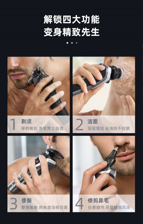 锐亿RS375剃须刀是由洁面、鼻毛修剪器、鬓角刀、剃须刀四合一的一款剃须产品。