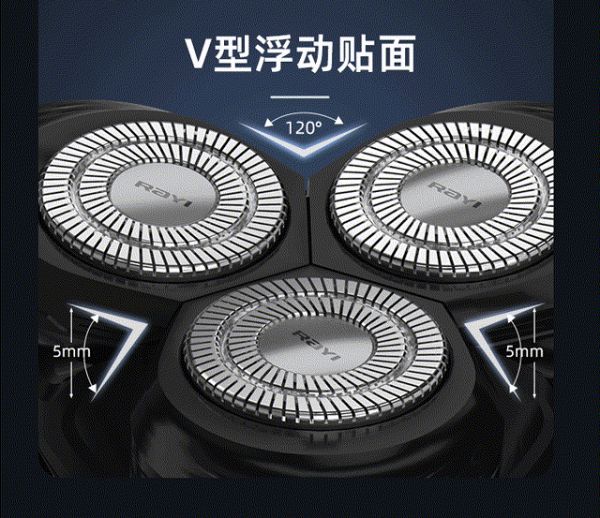 锐亿RS375理容剃须刀在传统剃须刀双重刀网设计基础上,增加了V型浮动系统,更贴面,剃须更干净。