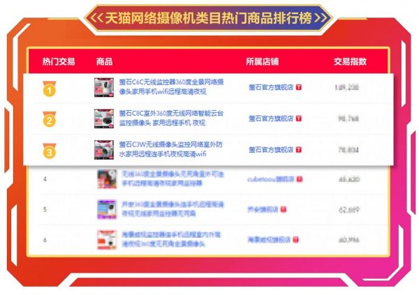 作为萤石连续多年蝉联天猫、京东同品类top1的智能家居摄像机,在本届618依然独占鳌头。据官方数据显示,6月16日,萤石智能家居摄像机、智能猫眼稳居天猫、京东双平台行业第一,6月18日0点至10点,萤石C6C、C8C、C3W智能家居摄像机分别占据天猫网络摄像机类目热门商品排行榜前三。凭借着灵活的360°云台旋转、高清画质、星光级夜视、移动侦测追踪、双向语音通话功能,C6系列摄像机为用户打造了安全且智能的室内看护体验,再次利剑出击,成为萤石最强黑马!