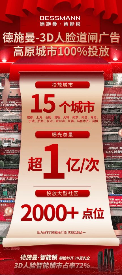 除了线上自带流量,集聚口碑好评外,在线下渠道德施曼还通过大型社区广告“德施曼3D人脸智能锁市占率72%”,覆盖了全国各大重点城市中高端小区近2000+点位,第一阶段总曝光量超1亿次。